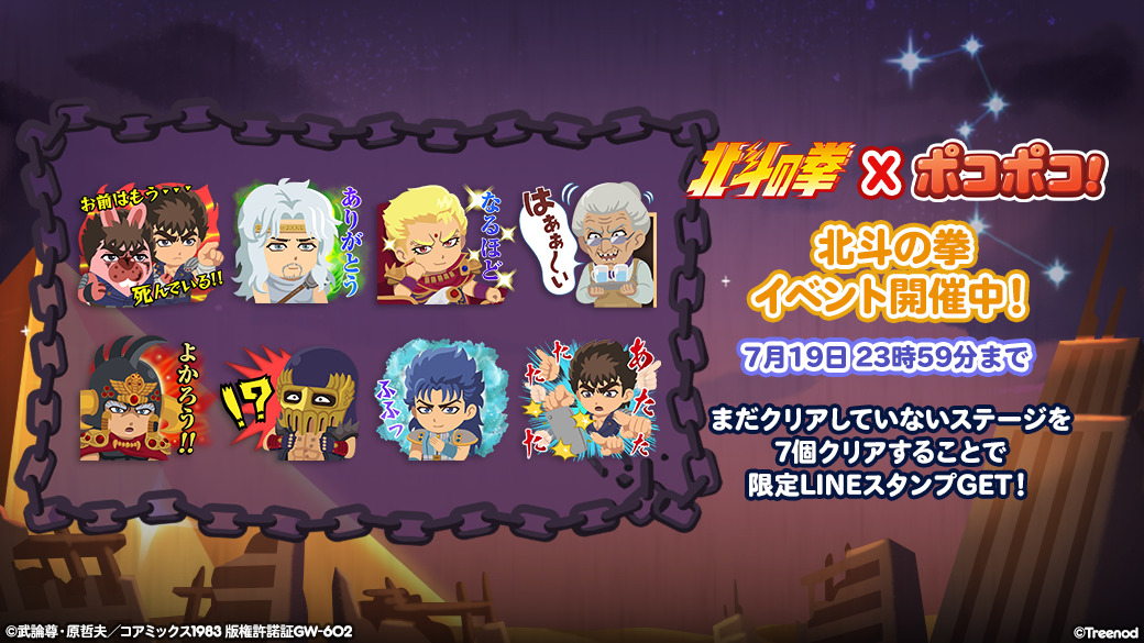 To commemorate the collaboration, we will deliver "Fist of the North Star" collaboration limited LINE stamps (8 types in total) that can only be obtained here.Please check the in-game notice for how to get it.