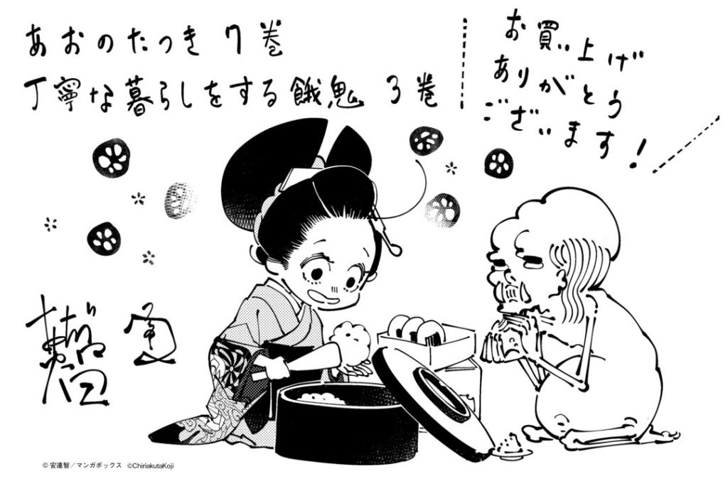 Como privilegio de compra común de la librería para el Volumen 7 de “Ao no Tatsuki”, estamos distribuyendo papel de ilustración recién dibujado con los personajes principales “Ao” y “Gaki” extraídos de ambas obras. (Comuníquese con cada librería con respecto a la distribución).