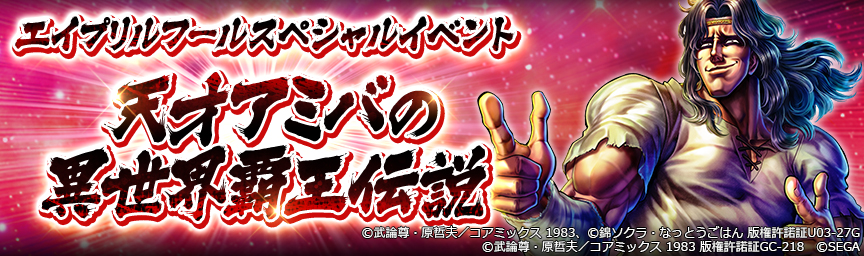 200万ダウンロードを突破した、伝説的漫画『北斗の拳』(原作:武論尊・漫画:原哲夫)を題材としたスマートフォン向けゲームアプリ『北斗の拳 LEGENDS ReVIVE (以下、「北斗リバイブ」)』にて、『北斗の拳』のスピンオフ作品『北斗の拳外伝 天才アミバの異世界覇王伝説』との外伝イベントとして、「アミバ 異世界覇王伝説」が2023年4月1日(土)より登場します。