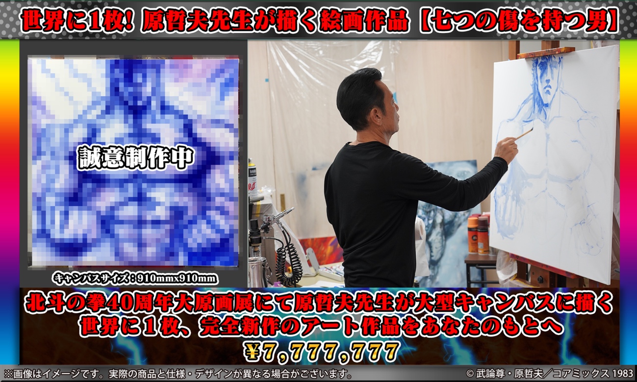 そして、新たなリターン品最大の目玉として原哲夫先生が910mm×910mmのキャンバスに完全描き下ろしする絵画作品「七つの傷を持つ男」が登場!北斗の拳40周年を記念する世界でただ一つの超大作アート。通常は原画の販売をしない原哲夫先生渾身の作品が手に入るチャンスを見逃すな!