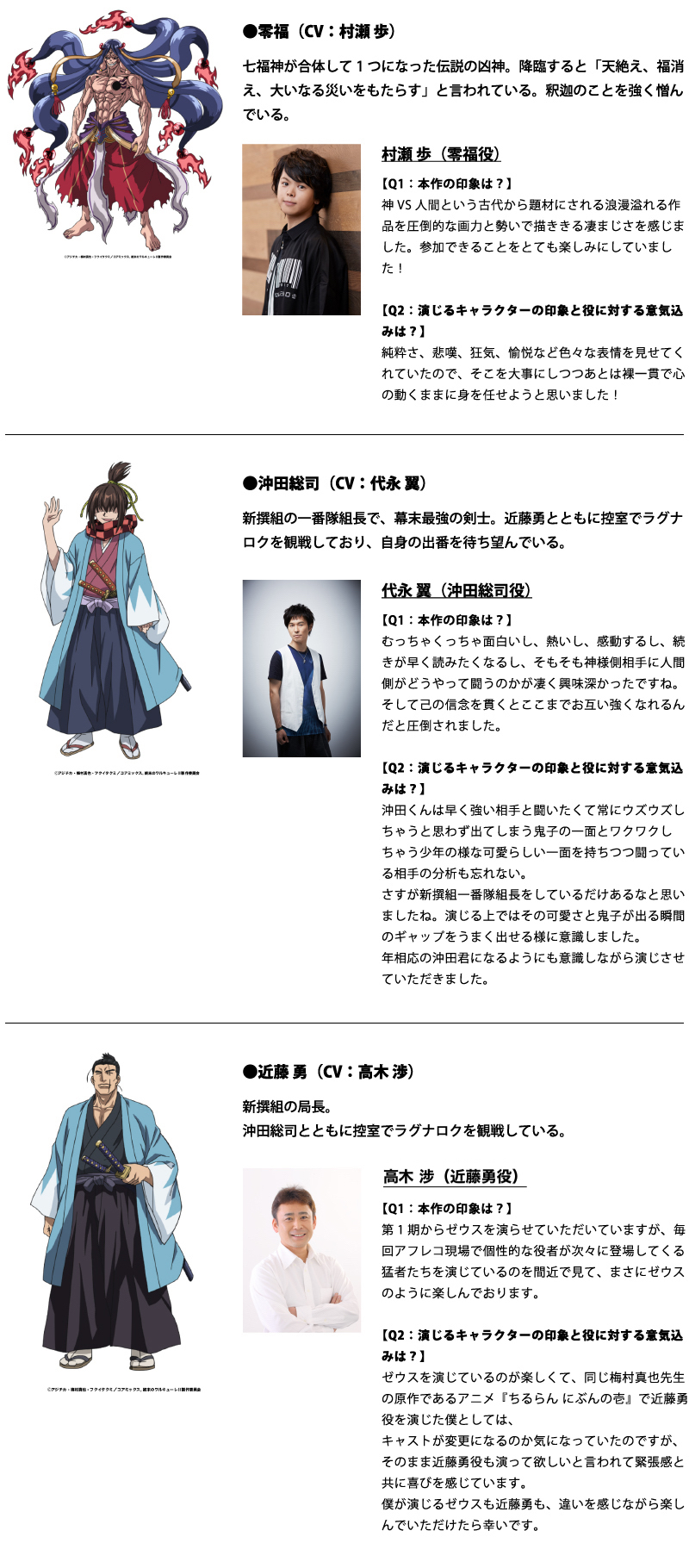 さらに、追加キャラクター&キャストを解禁! 零福(CV:村瀬 歩)、沖田総司(CV:代永 翼)、近藤 勇(CV:高木 渉)、フレック(CV:井上ほの花)、スルーズ(CV:三木 晶)の情報が新たに公開となりました。 各キャストからはコメントも到着しています。