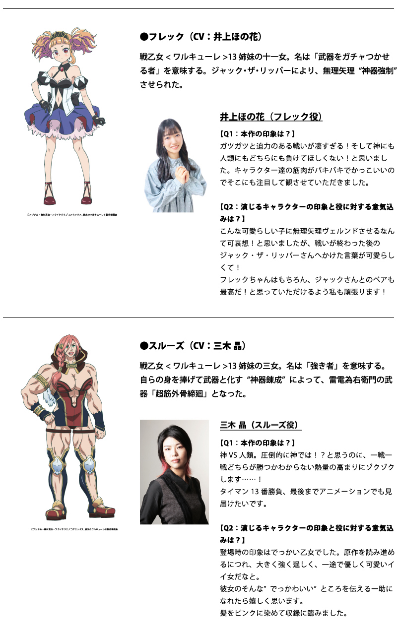 ●CAST ブリュンヒルデ:沢城みゆき ゲル:黒沢ともよ ジャック・ザ・リッパー:杉田智和 ヘラクレス:小西克幸 雷電為右衛門:木村 昴 シヴァ:鈴木達央 釈迦:中村悠一 零福:村瀬 歩 沖田総司:代永 翼 近藤勇:高木渉 フレック:井上ほの花 スルーズ:三木 晶