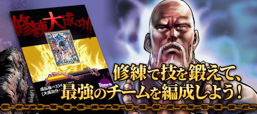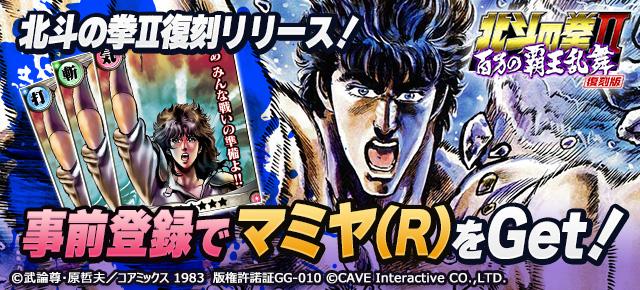 2012年4月にサービスを開始し人気を博した「北斗の拳II~百万の覇王乱舞~」が復刻版として、漫画「北斗の拳」の第一部~第二部最終章の全キャラクターの技が再び美麗カードで復活します。あの名セリフと共に様々な技や奥義が繰り出されるバトルをお楽しみください。