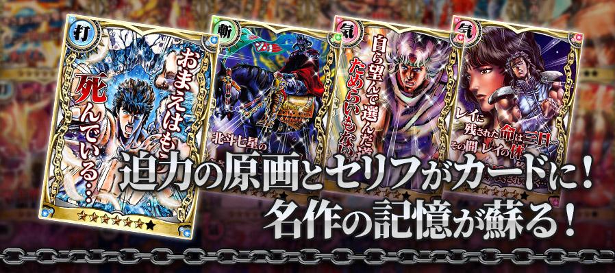 漫画「北斗の拳」の第一部~第二部最終章の全キャラクターの技がカードとなり再登場。